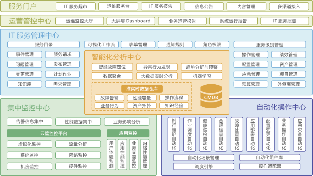 SIMO全棧功能??橐允滌夢(mèng)謚跡閱?榛?、服務(wù)化為設(shè)計(jì)理念,其主要模塊包含5個(gè)中心、1個(gè)門戶——集中監(jiān)控中心、IT服務(wù)管理中心、自動(dòng)化操作中心、智能化分析中心、運(yùn)營(yíng)管控中心,以及服務(wù)。